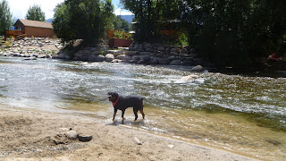 We drove into town and parked down by the Arkansas River. The past couple of days we witnessed dog after dog having a great time in the water. Today was Sire's turn. As soon as he smelled the water, he was in it. He had a great time. We let him get wet for a while and then took him for a long walk.